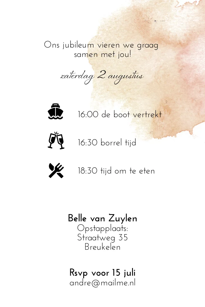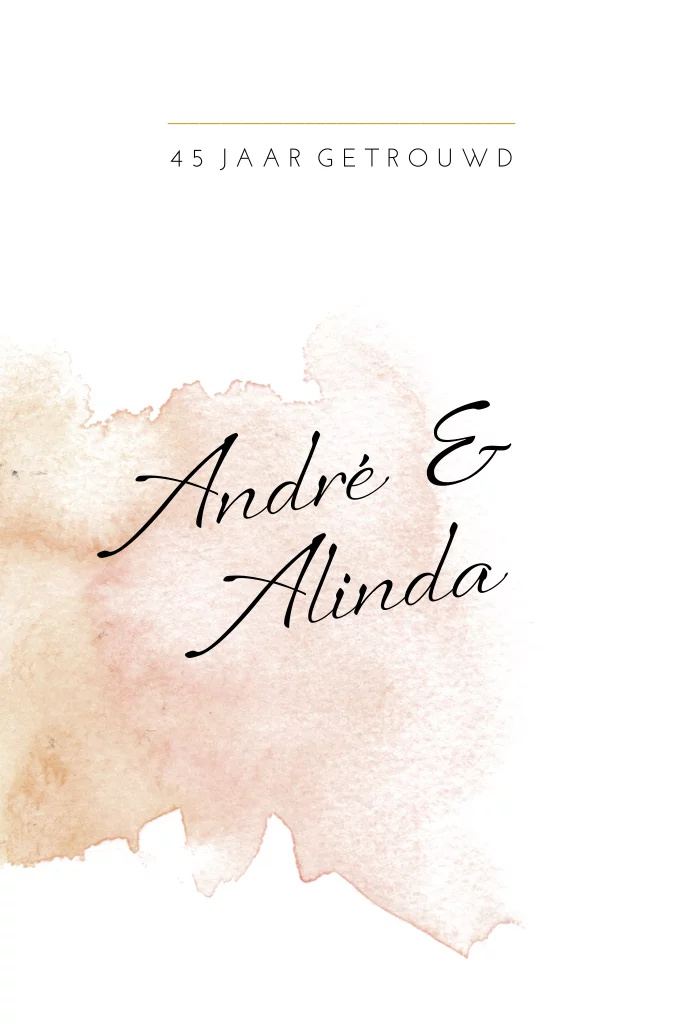 Opzoek naar een romantic chic 45 jarig huwelijksjubileum kaart? Met pastel tint oranje en roze watercolor effect als ondergrond en met veel stijlvolle trouw icoontjes. Zelf maken!
