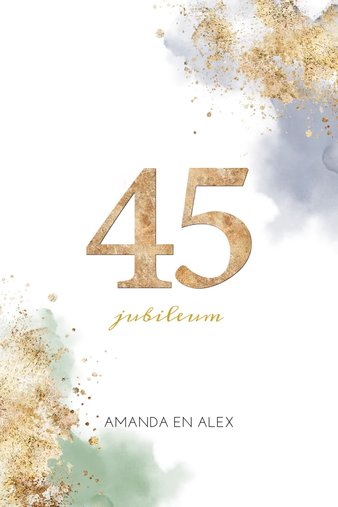 Opzoek naar een romantic chique 45 jarige huwelijksjubileum uitnodigingskaart? Met mint groene en blauwe watercolor brush op de ondergrond, goudpoeder look en stijlvolle icoontjes. Zelf maken!