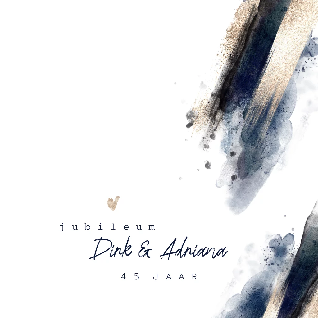 Trendy 45 jarig jubileumkaart in donkerblauw, met goudkleurige verf strepen look. (geen echt goud). Aan de binnenzijde een fotokader voor het plaatsen van een eigen foto.