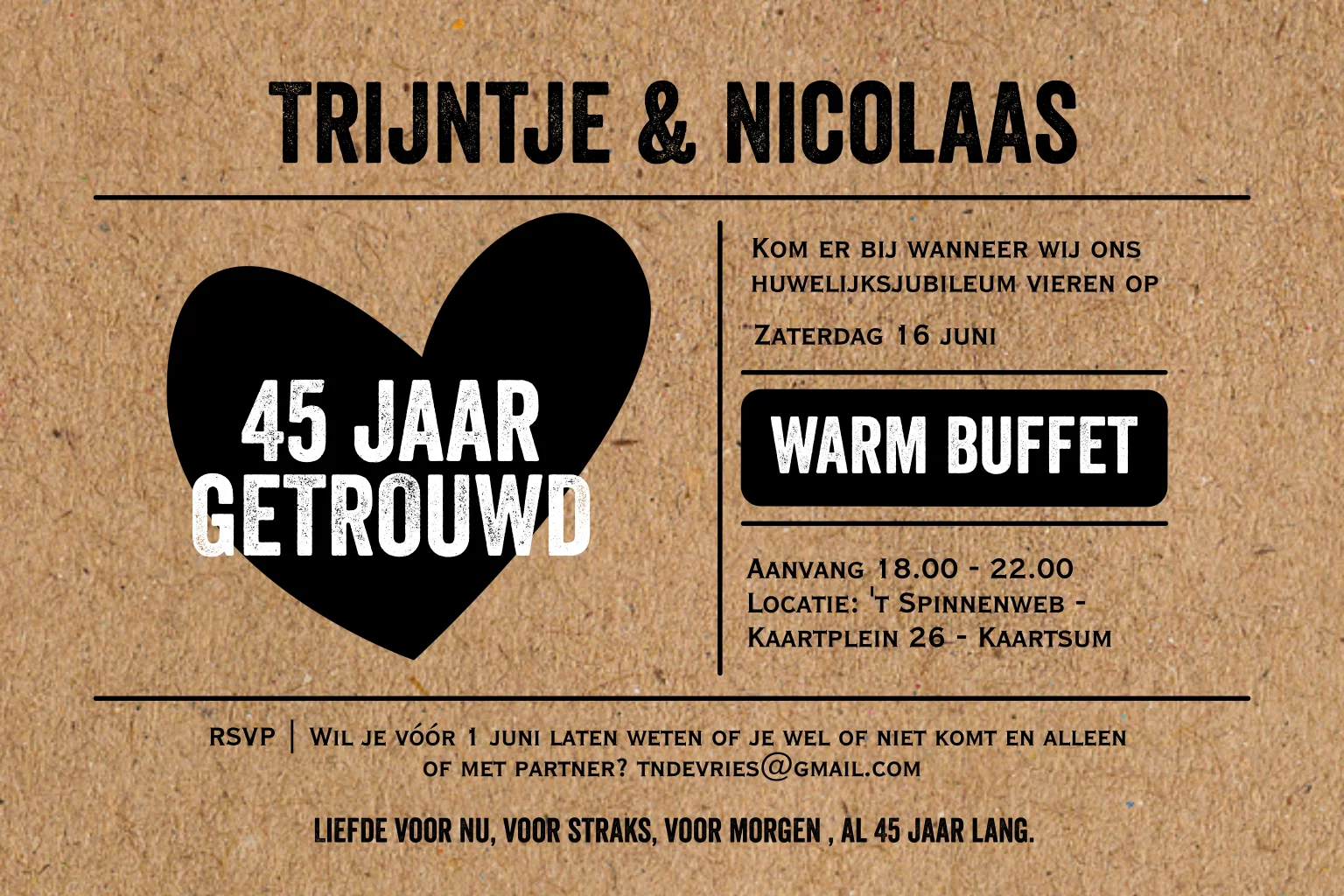 Stoere uitnodiging voor een 45 jarig huwelijksjubileum in zwart wit met een kraft-look ondergrond. Liever een andere kleur? In onze editor kun je gemakkelijk zelf de kleuren aanpassen. Probeer maar!