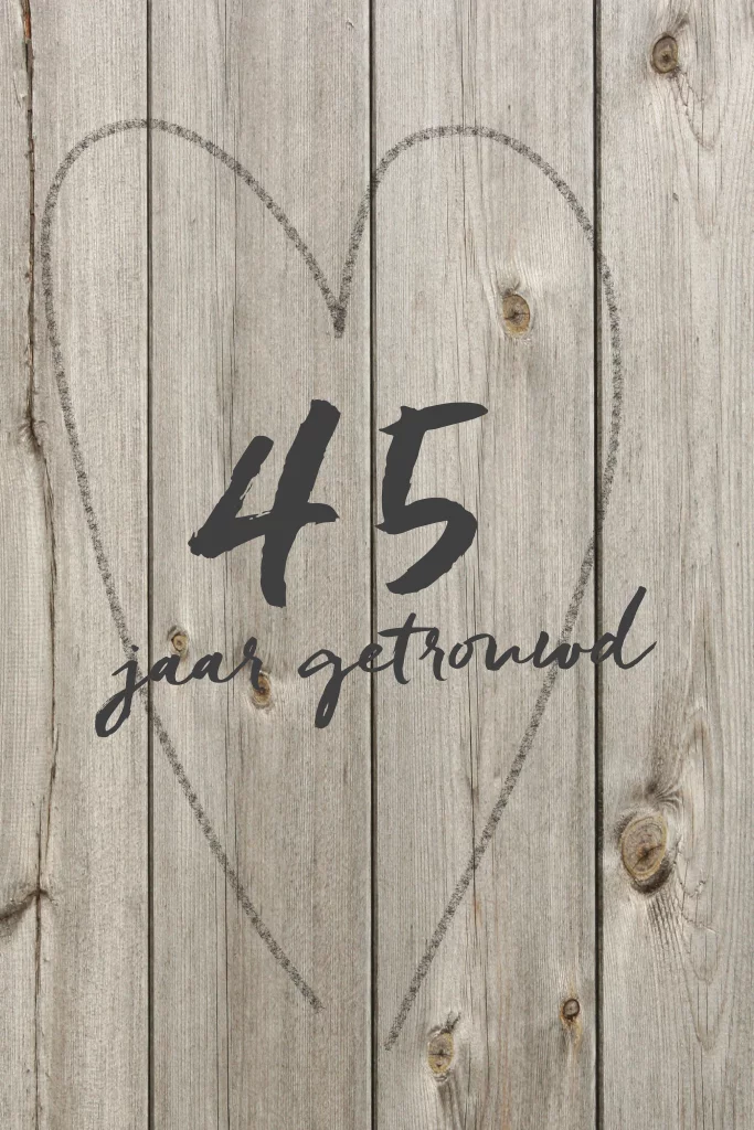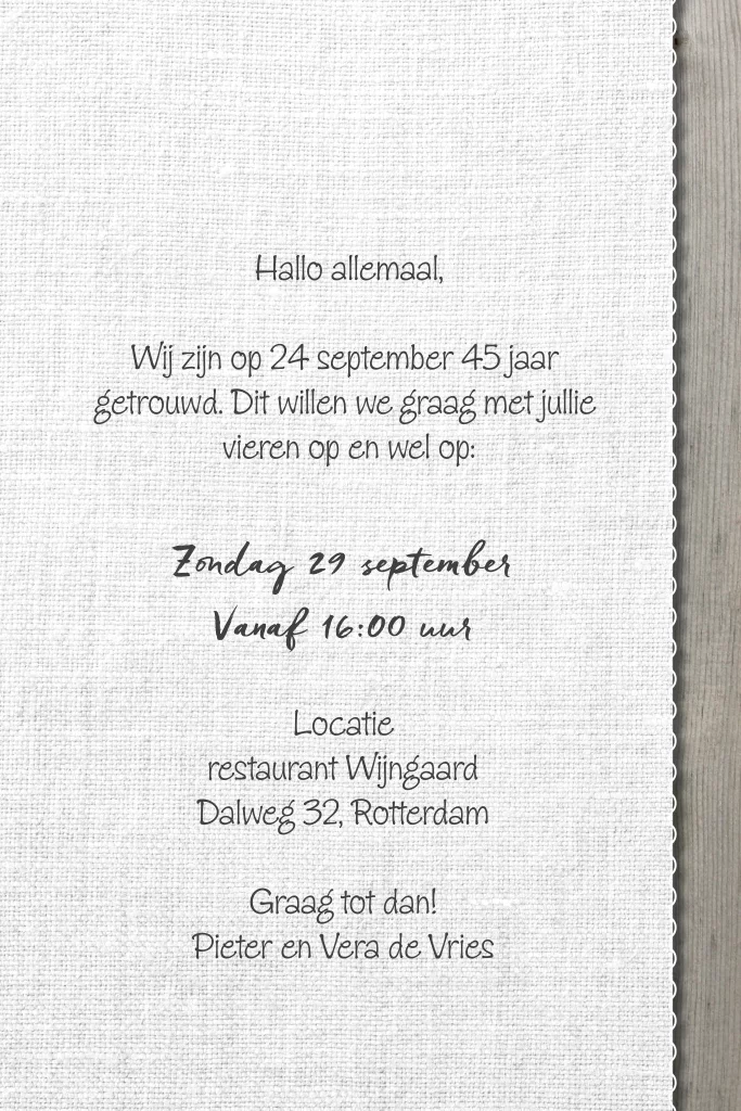 45 jaar getrouwd? Een mooie staande uitnodigingskaart met hout print, linnen, leer en foto. In landelijke stijl.