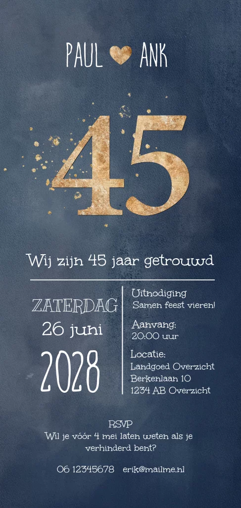 Moderne enkele kaart voor 45 jarig huwelijksjubileum donker blauwe watercolor look, cijfer 45 in goud poeder look en met vlakverdeling. Extra lang formaat 10x21cm.
