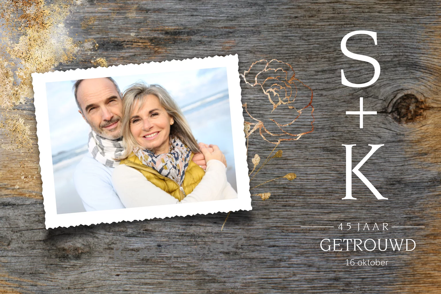 Stijlvolle uitnodiging voor jullie 45 jarig huwelijksjubileum. Ondergrond met hout look. Met fotokader, goudkleurige spetters en bloemen. (geen echt goud)