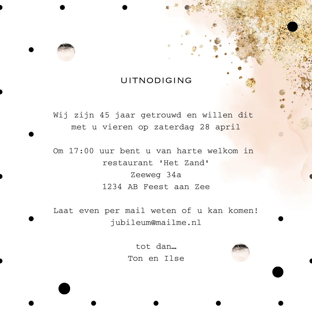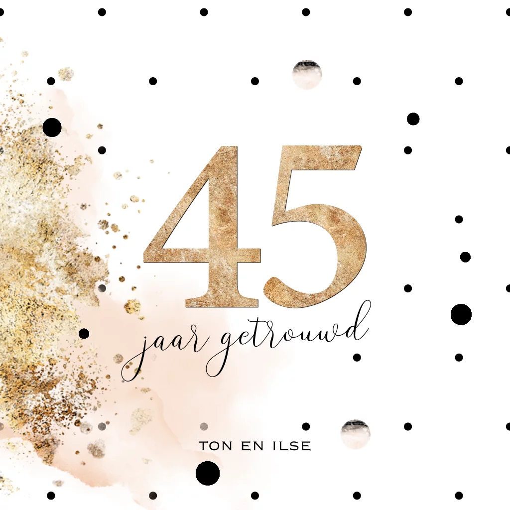 Eerdaags een feest geven? Unieke feestelijke uitnodigingskaart voor jullie 45 jarige huwelijksjubileum met roze watercolor, zwart stippen confetti en gouden glitter look (geen echt goud inkt).