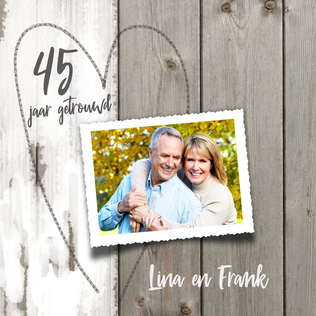 Unieke foto 45 jarig huwelijks jubileumkaart hout