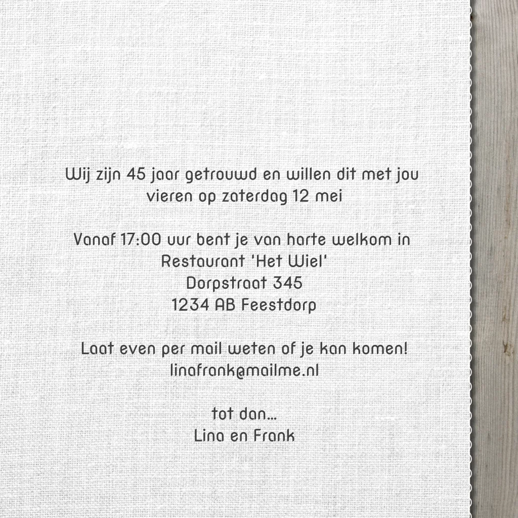 Eerdaags 45 jaar getrouwd? Originele uitnodiging voor jullie huwelijksfeest met hout look en verf streep, foto kader zelf maken.