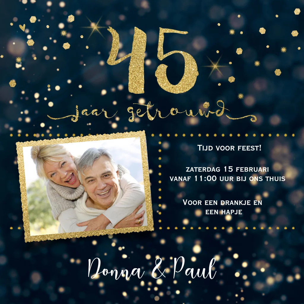 Deze elegante 45 jaar getrouwd is prachtig voor het versturen tijdens de winterse dagen. Met goudkleurige confetti snippers op een donkerblauwe ondergrond met sierletters en eigen foto. Geen echt goud, print. Zelf maken!