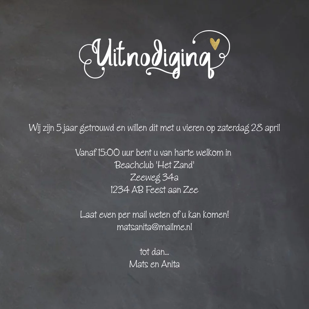 Eerdaags jullie 5 jarig huwelijks jubileum feest geven? Mooie uitnodiging met krijtbord print en hand lettering.