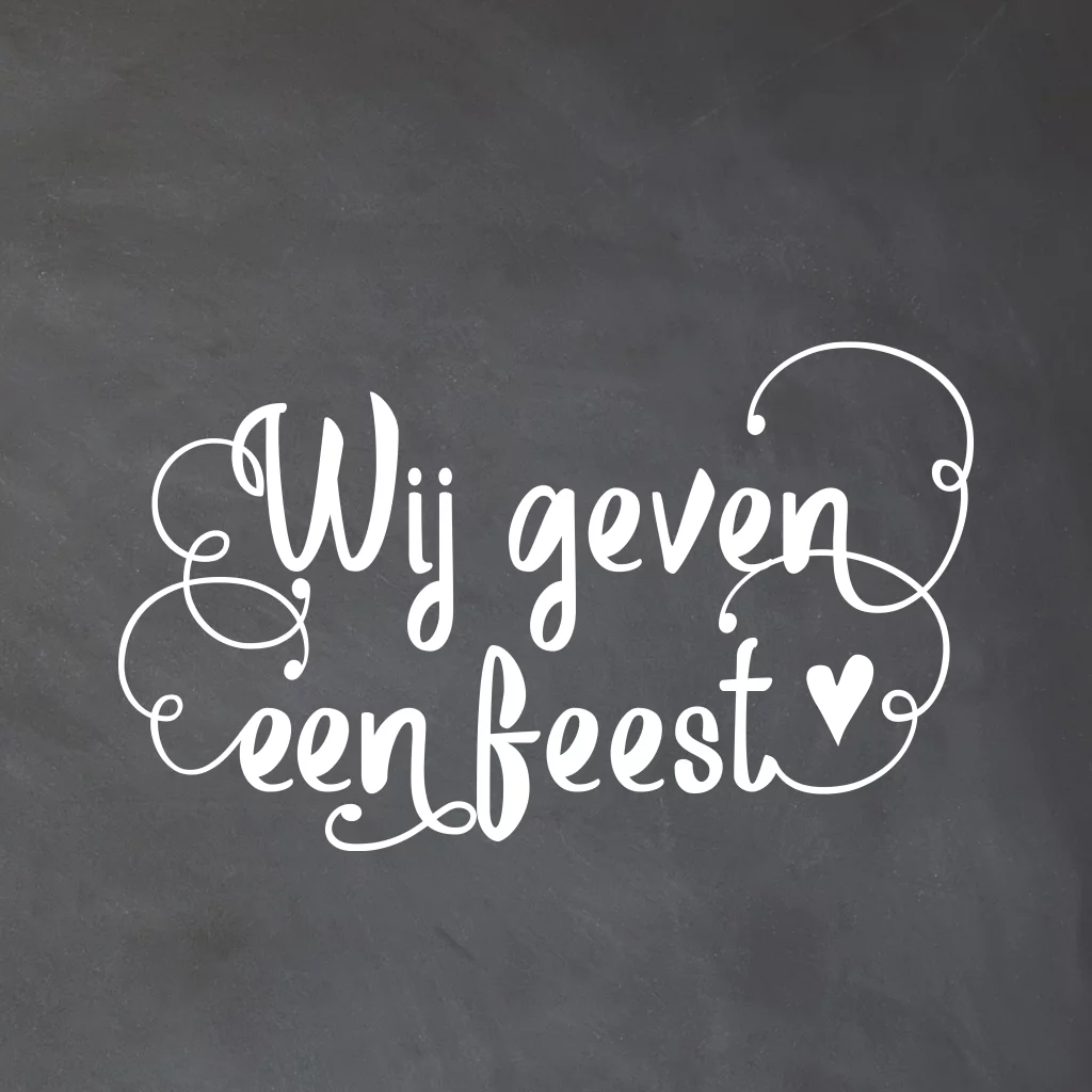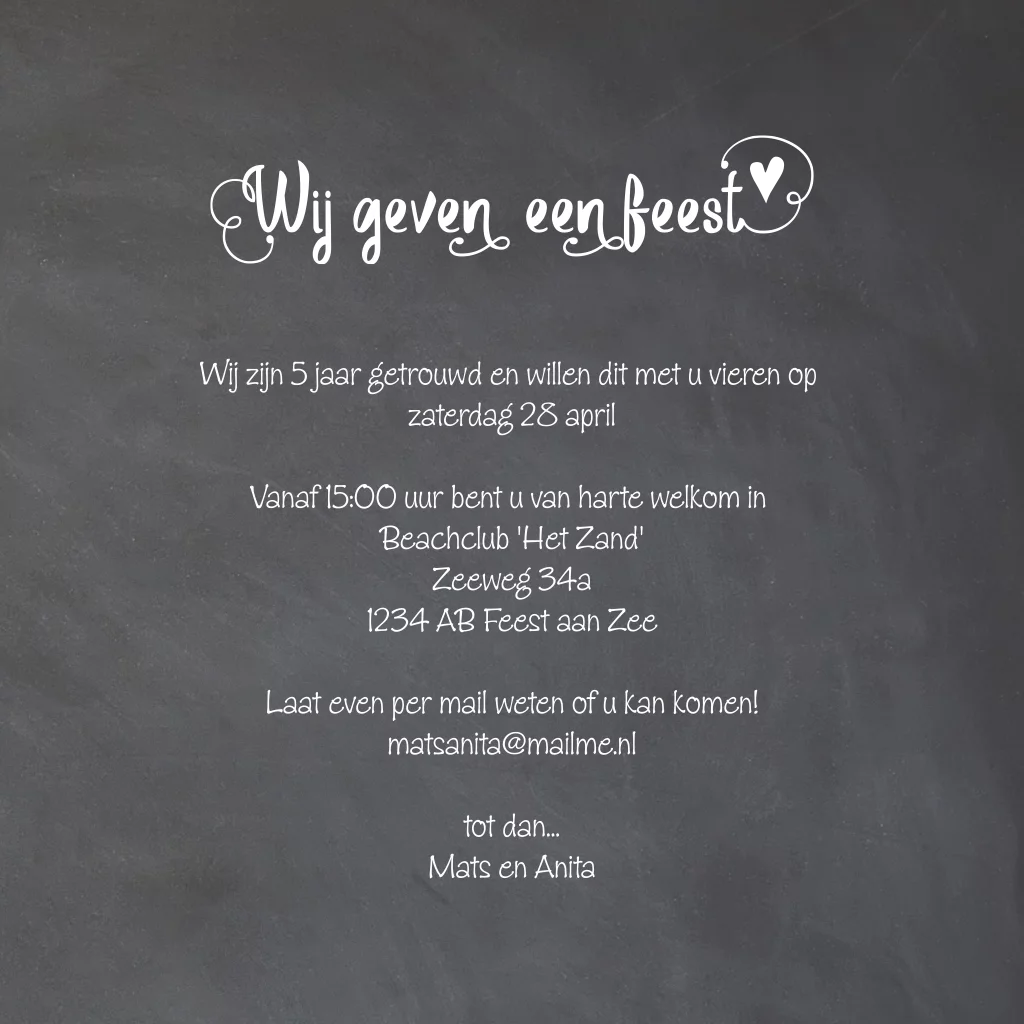 Eerdaags jullie 5 jarig huwelijksjubileum feest geven? Mooie uitnodiging met krijtbord print en hand lettering met Wij geven een feest