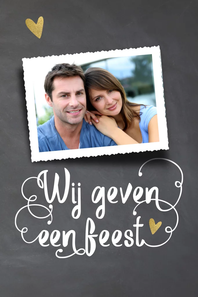 Eerdaags jullie 5 jarig huwelijks jubileum feest geven? Mooie uitnodiging met foto kader, krijtbord print en sierletters met Wij geven een feest