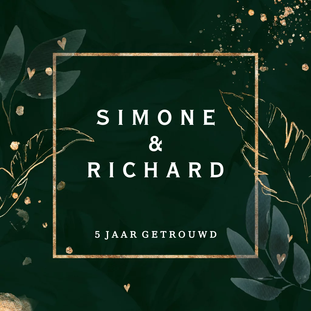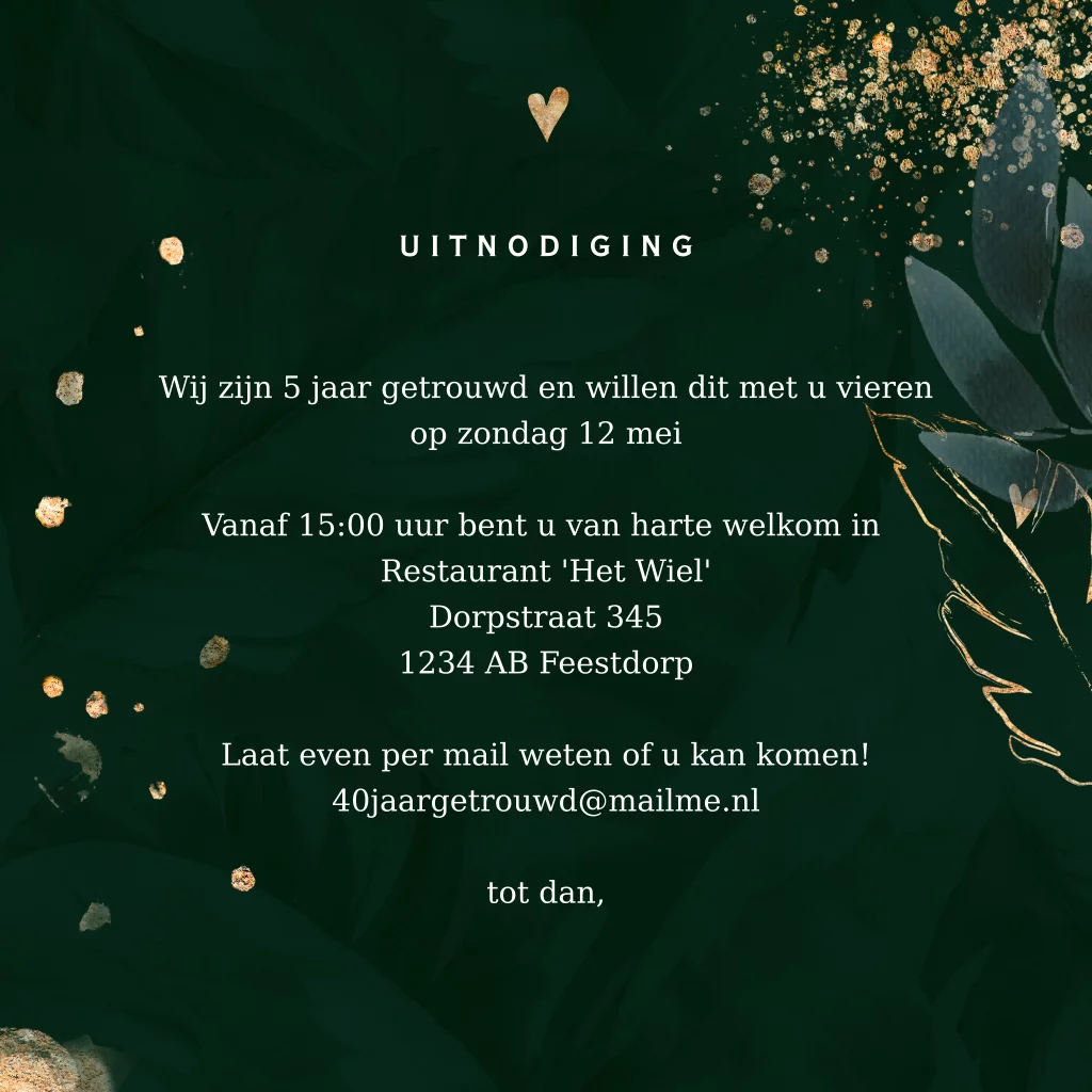 Prachtige uitnodiging voor jullie 5 jarig huwelijksjubileum met donkergroene achtergrond, bladeren en goudlook elementen.