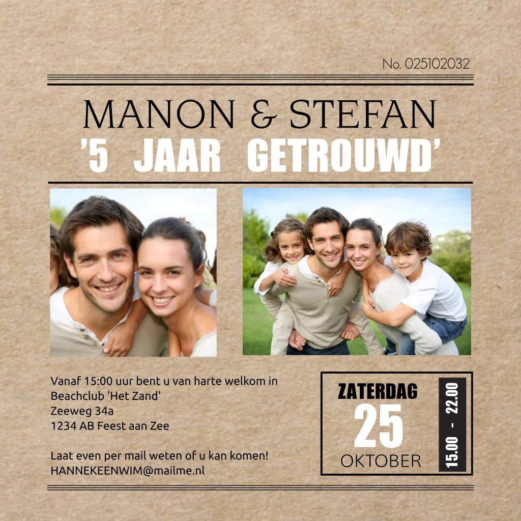 Stoere 5 jarig huwelijksjubileumkaart met de layout van een krant op een kraft look ondergrond. Plaats jullie eigen foto's of vervang deze voor eigen tekst. Foto's zijn in onze editor te verkleinen en bij te snijden echt heel makkelijk!