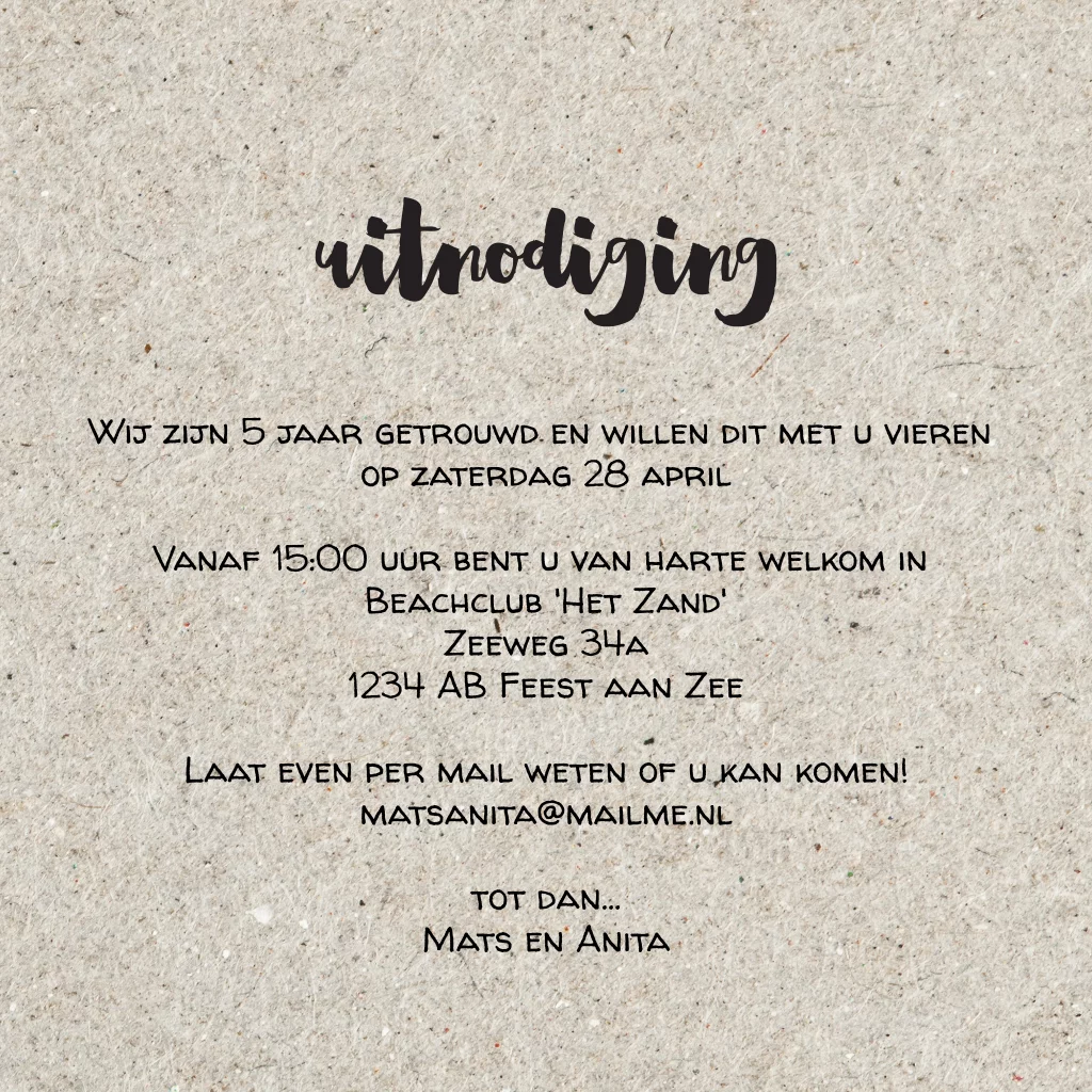 Eerdaags jullie 5 jarig huwelijks jubileum feest geven? Mooie uitnodiging met losse teksten in modern lettertype, goud gekleurde hartjes en de ondergrond heeft een kraft look.