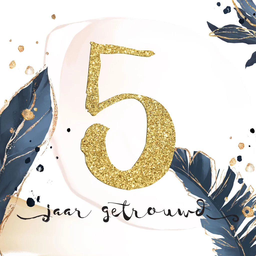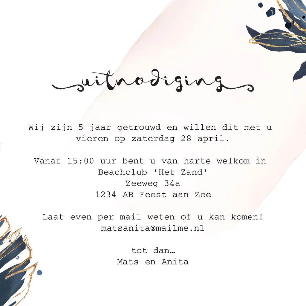 Eerdaags jullie 5 jarig huwelijks jubileum feest geven? Vrolijke uitnodiging met goud look cijfer en boho stijl.