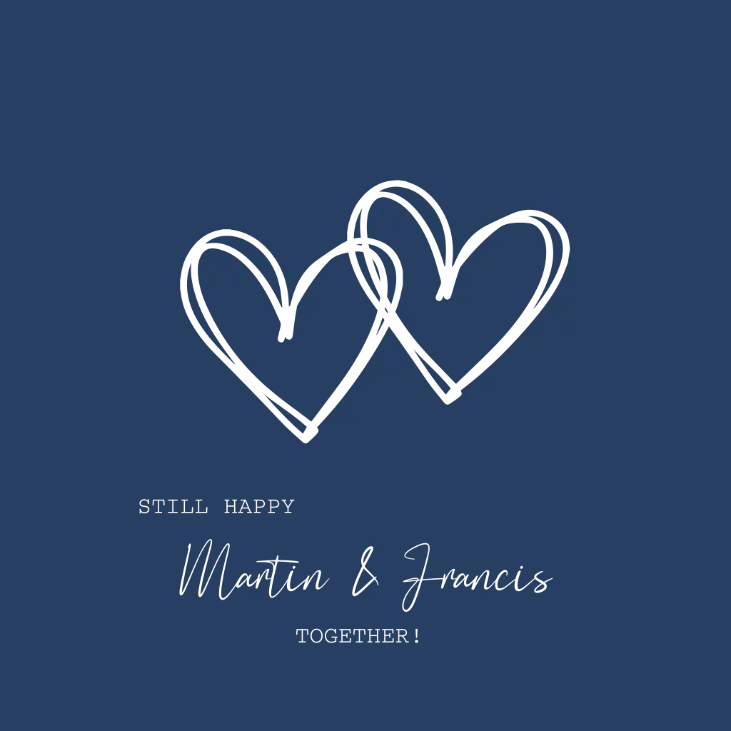 Trendy jubileumskaart in donkerlbauw, met groot goudkleurig hart in verf look. (geen echt goud). Aan de binnenzijde 2 goudkleurige fotokaders voor het plaatsen van een eigen foto.
