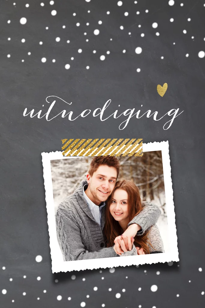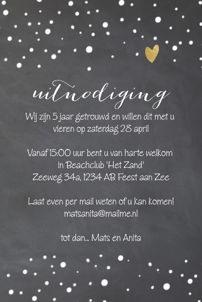 Eerdaags jullie 5 jarig huwelijks jubileumfeest geven? Mooie staande foto uitnodiging met goud hartje(geen echt goud inkt) krijtbord print op de ondergrond, confetti en handlettering.
