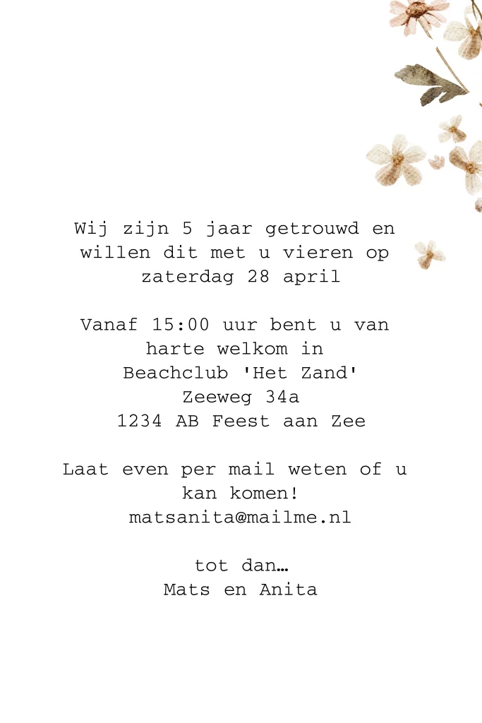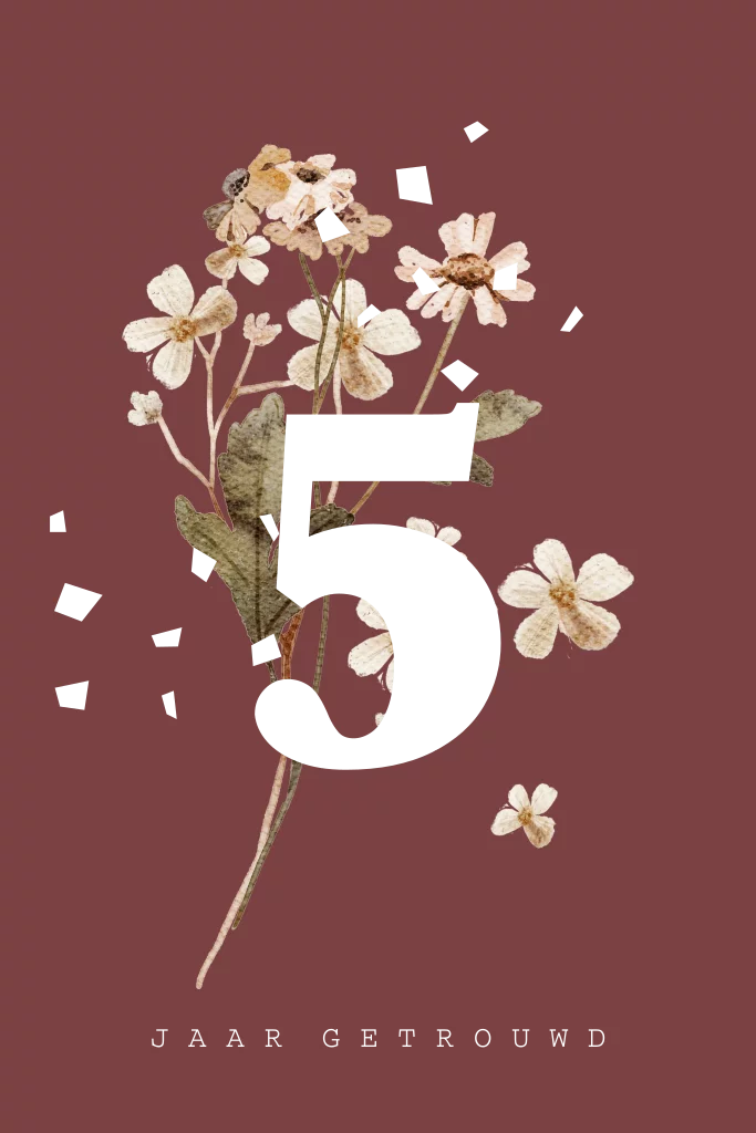 Eerdaags jullie 5 jarig huwelijksjubileum vieren? Unieke staande feestelijke uitnodigingskaart met bloemen.
