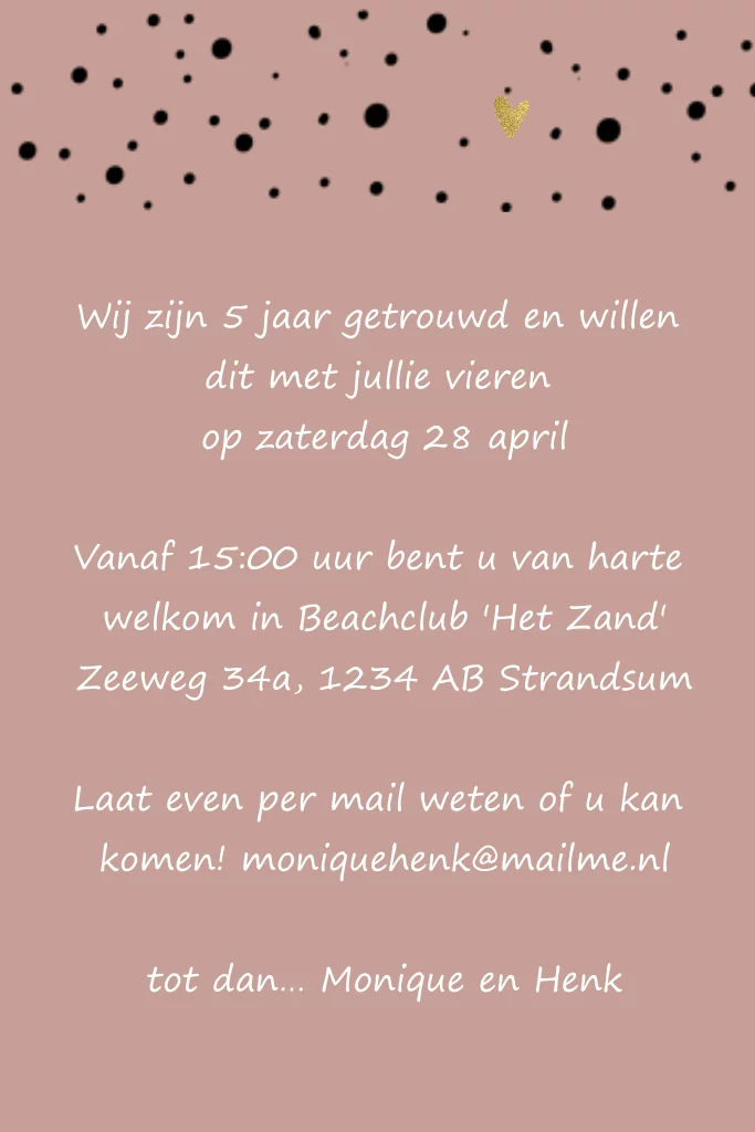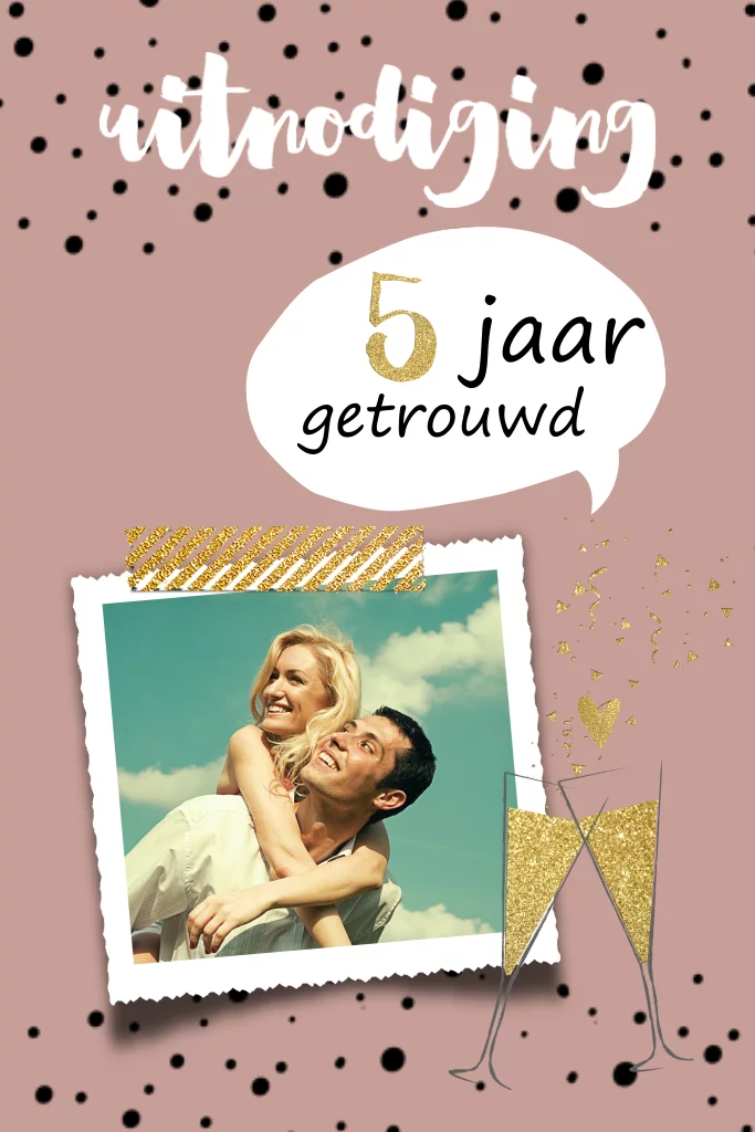 Eerdaags jullie 5 jarig huwelijks jubileumfeest geven? Mooie staande foto uitnodiging met goud look (geen echt goud inkt) rosy kleur met confetti op de ondergrond, champagne glazen en tekstballon.