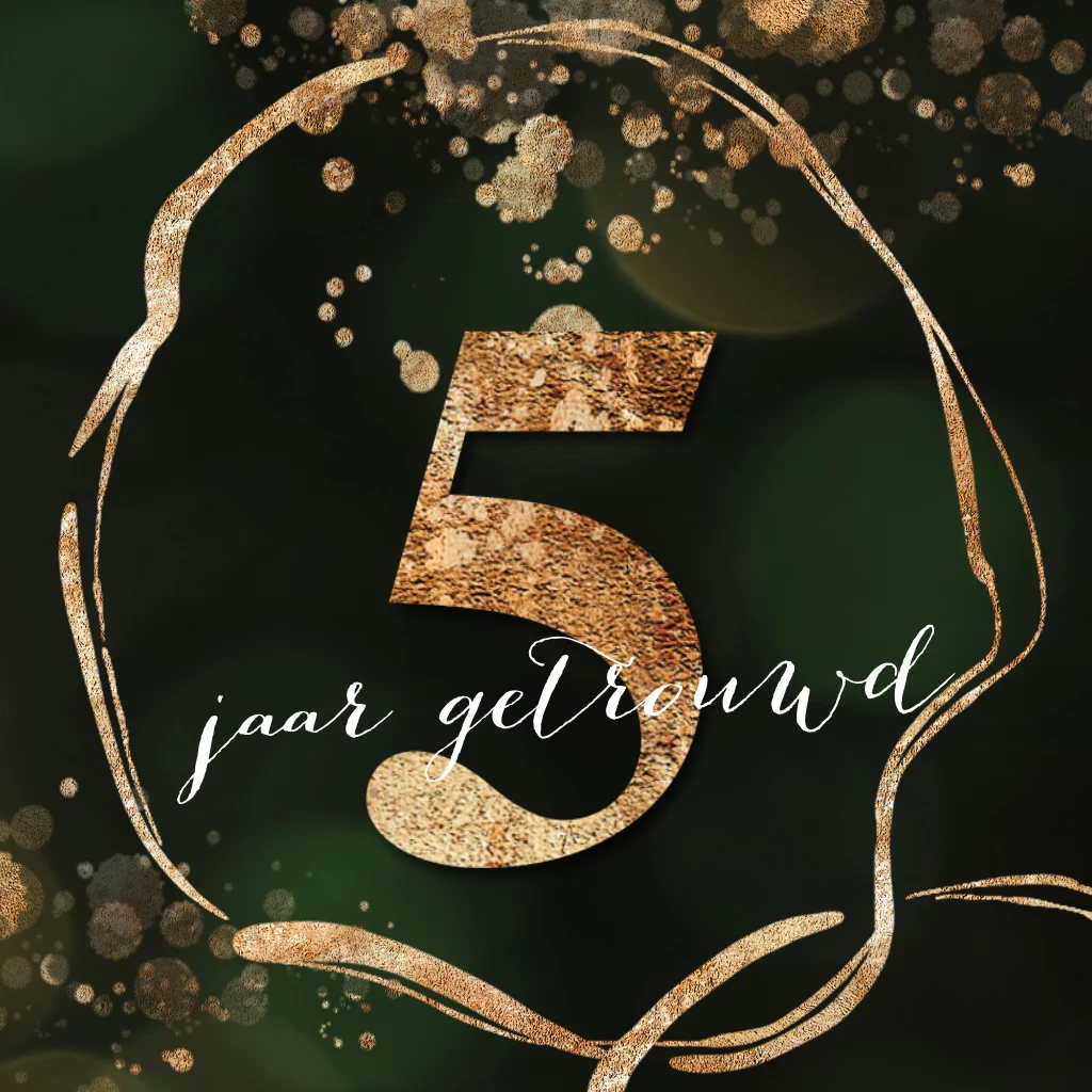 Prachtige uitnodiging voor een jubileum 5 jaar getrouwd met feestelijke groene ondergrond en goudlook confetti snippers.