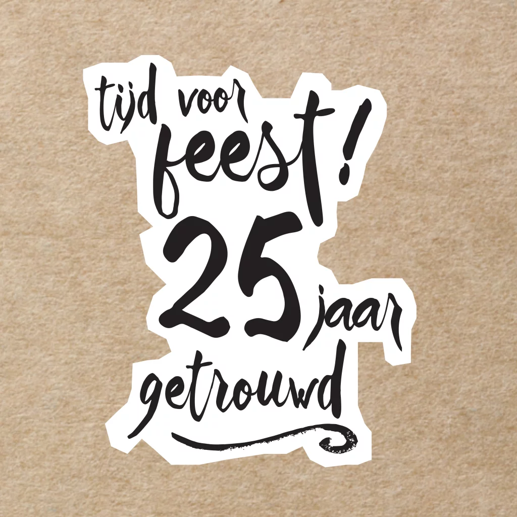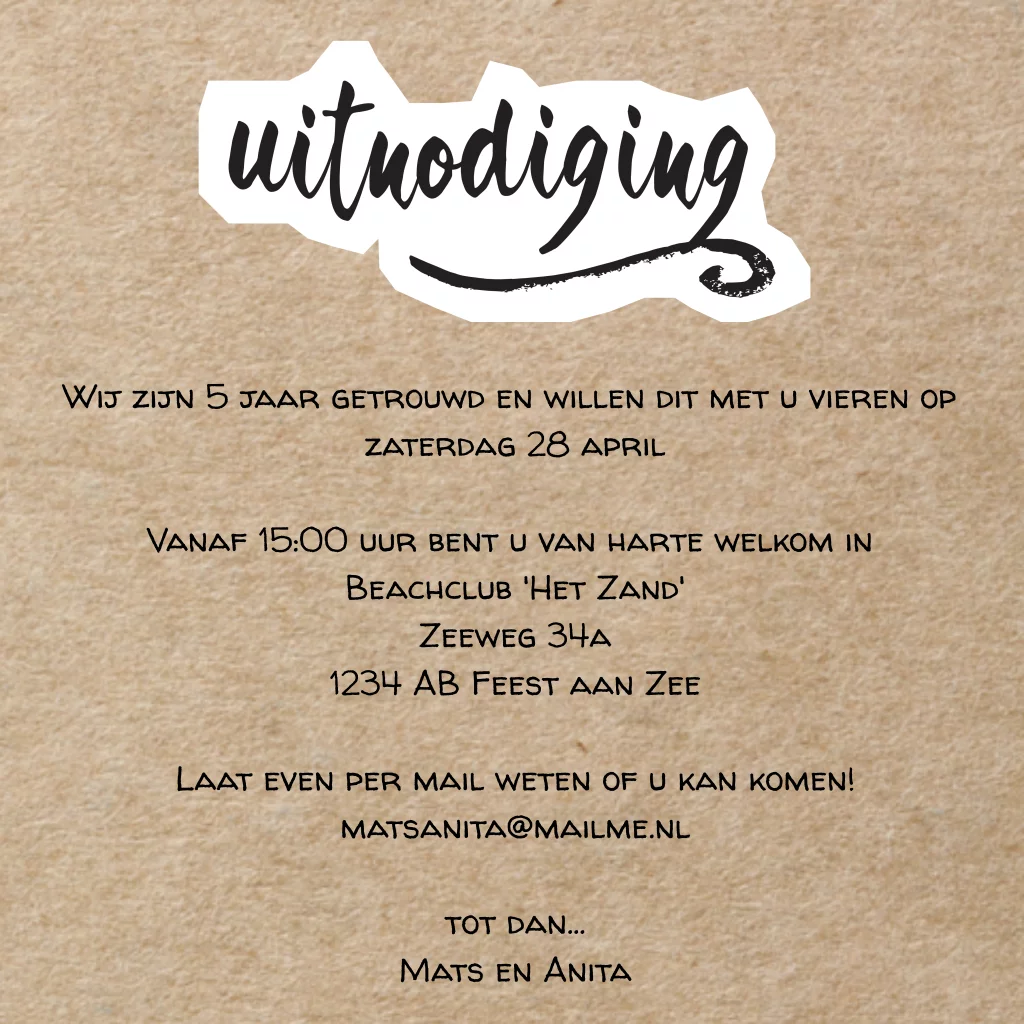 Eerdaags jullie 5 jarig huwelijks jubileum feest geven? Unieke uitnodiging met cartoon achtige lettertypes op een wit grof vlak met op de ondergrond een kraft design.