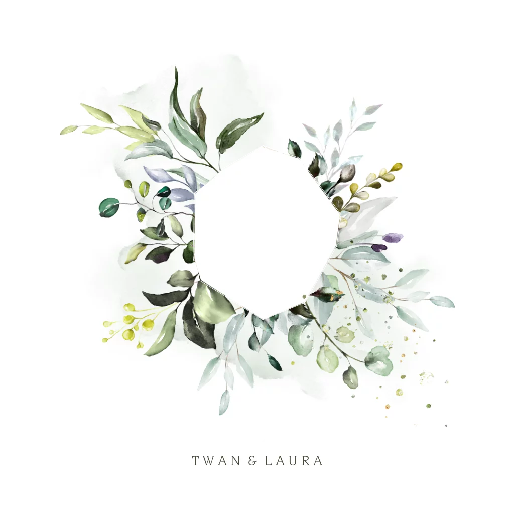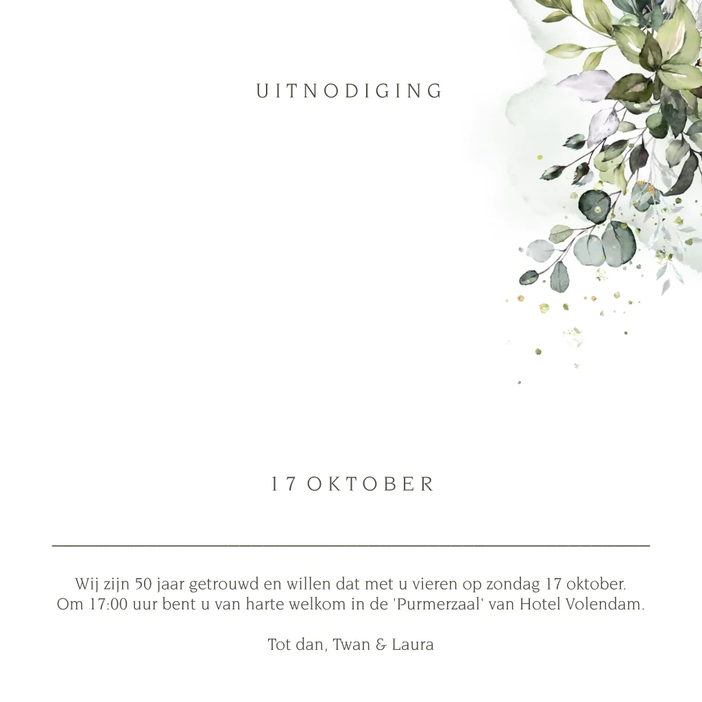 Botanische jubileumkaart 50 jaar getrouwd met een prachtige watercolor eucalyptus greenery bladeren in het groen tinten en écht goudfolie gedrukt.
