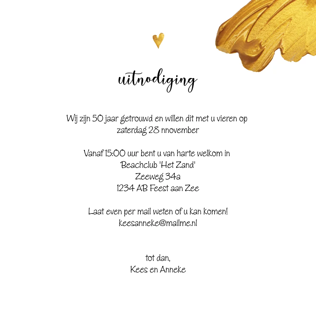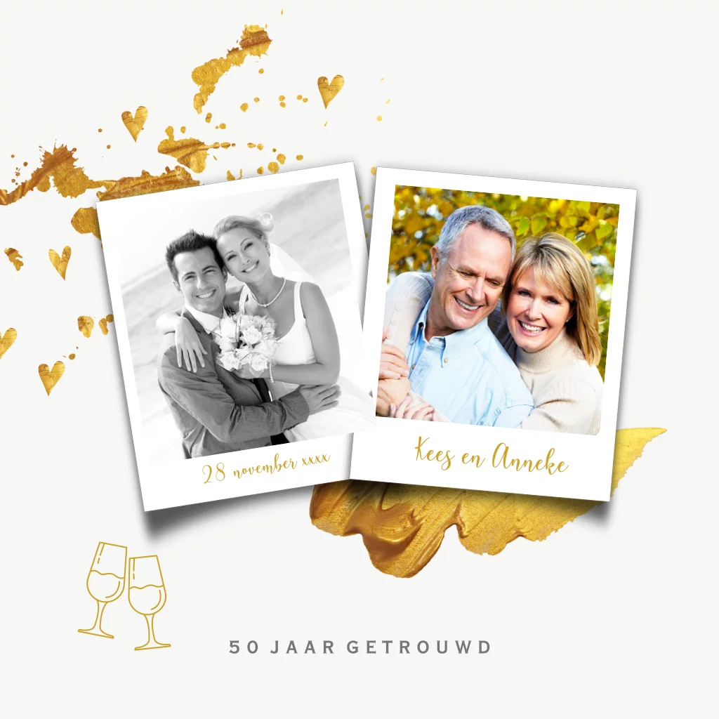 Eerdaags jullie 50 jarig huwelijks jubileum feest geven? Feestelijke uitnodiging met ruimte voor 2 foto's op de voorzijde! Met goud look verf spetters en hartjes.
