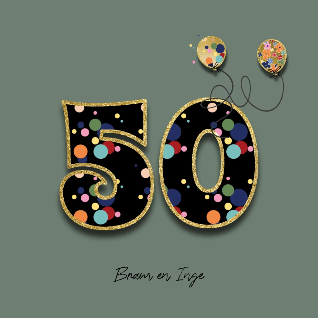 Eerdaags jullie 50 jarig huwelijks jubileum feest geven? Unieke uitnodiging cijfer 50 met goud look randje en confetti dots erin. En vrolijke gouden ballonnen met dots en bloemen. (goud - geen echt goud inkt). Zelf maken!
