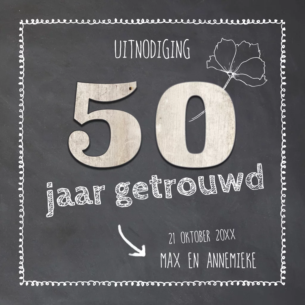 50 jaar getrouwd? Stijlvolle uitnodiging met krijtbord op de ondergrond en een witte sierrand rondom. Met houten cijfer 50. Zelf maken!