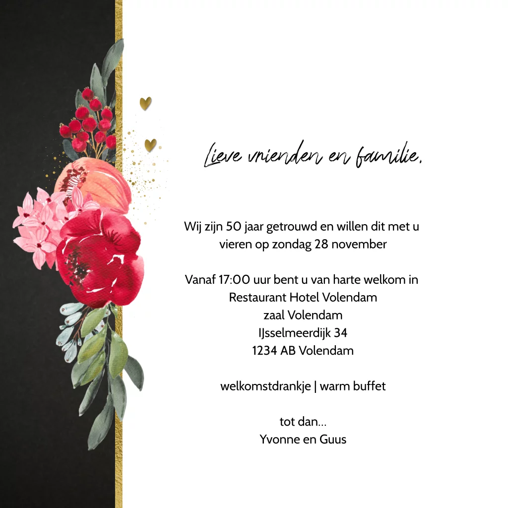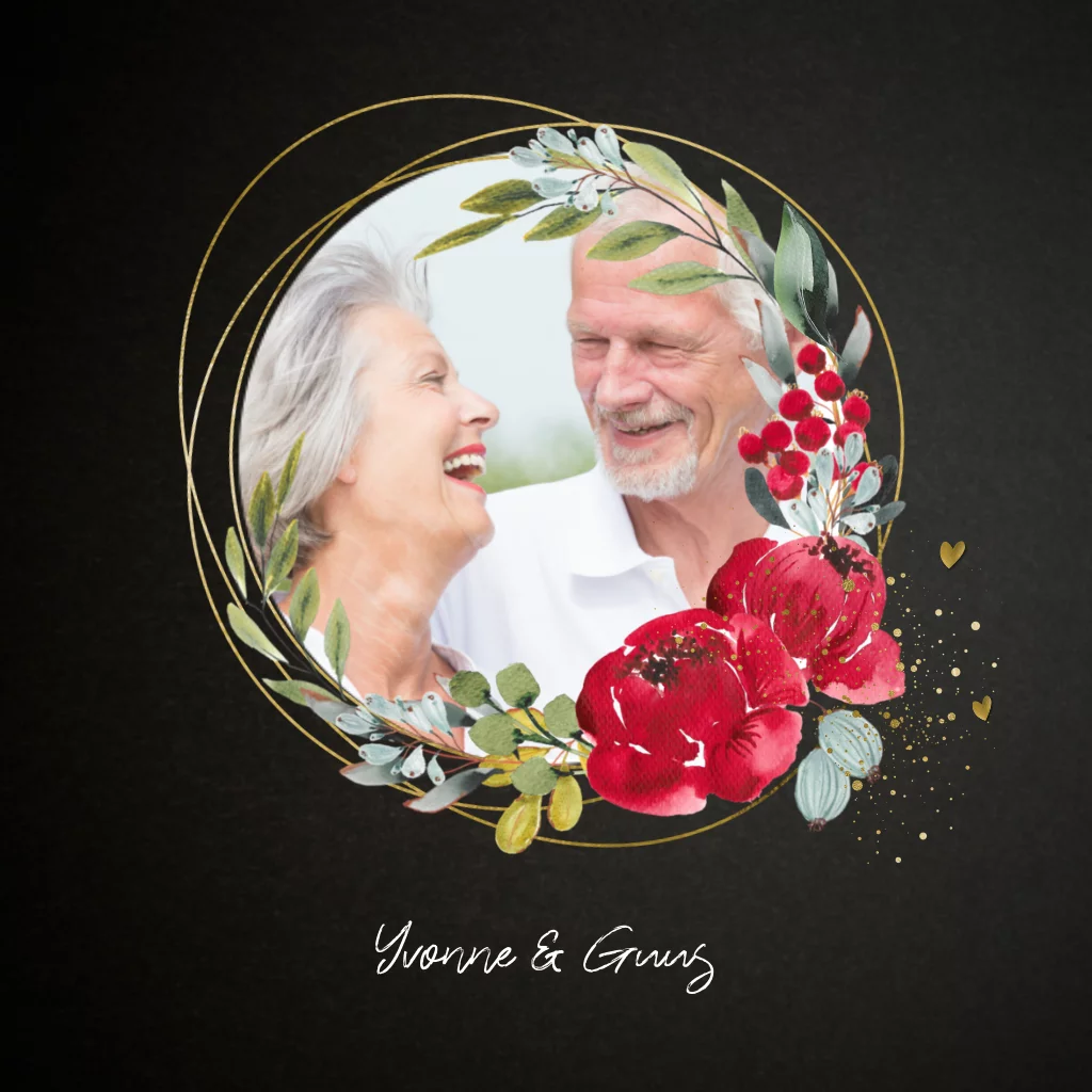 50 jarig huwelijksjubileum vieren? Stijlvolle uitnodiging met zwarte achtergrond. Fotogat voor het plaatsen van een eigen foto, goudkleurige cirkels (geen goudfolie) en diep rode bloemen. Alles staat los en is aan te passen.