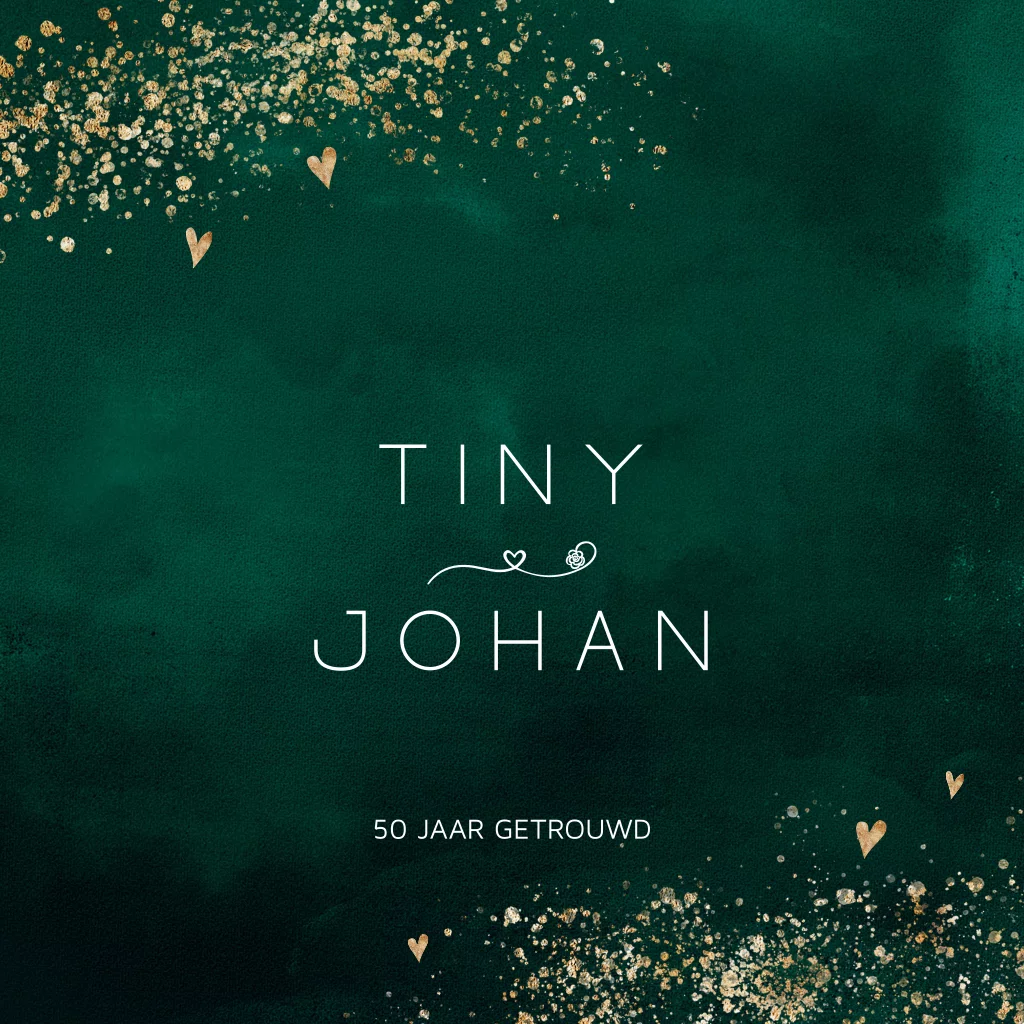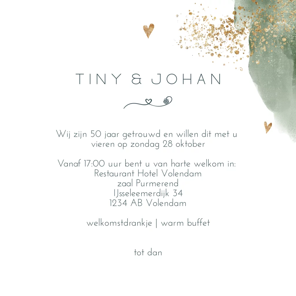 Chique uitnodiging voor jullie 50 jarig huwelijksfeest? Met donkergroene verf ondergrond met fijne hartjes en prachtig goudlook gekleurde kwast spetter effect. Alles staat los!