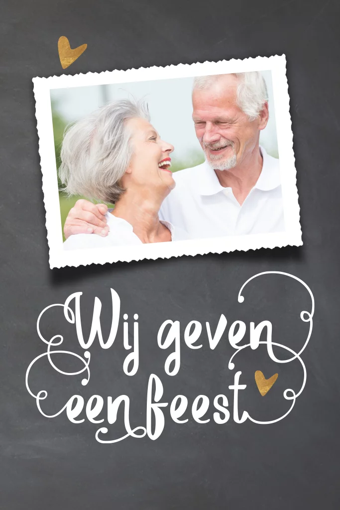 Eerdaags jullie 50 jarig huwelijks jubileum feest geven? Mooie uitnodiging met foto kader, krijtbord print en hand lettering.