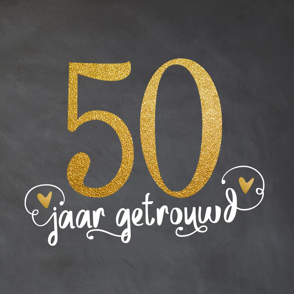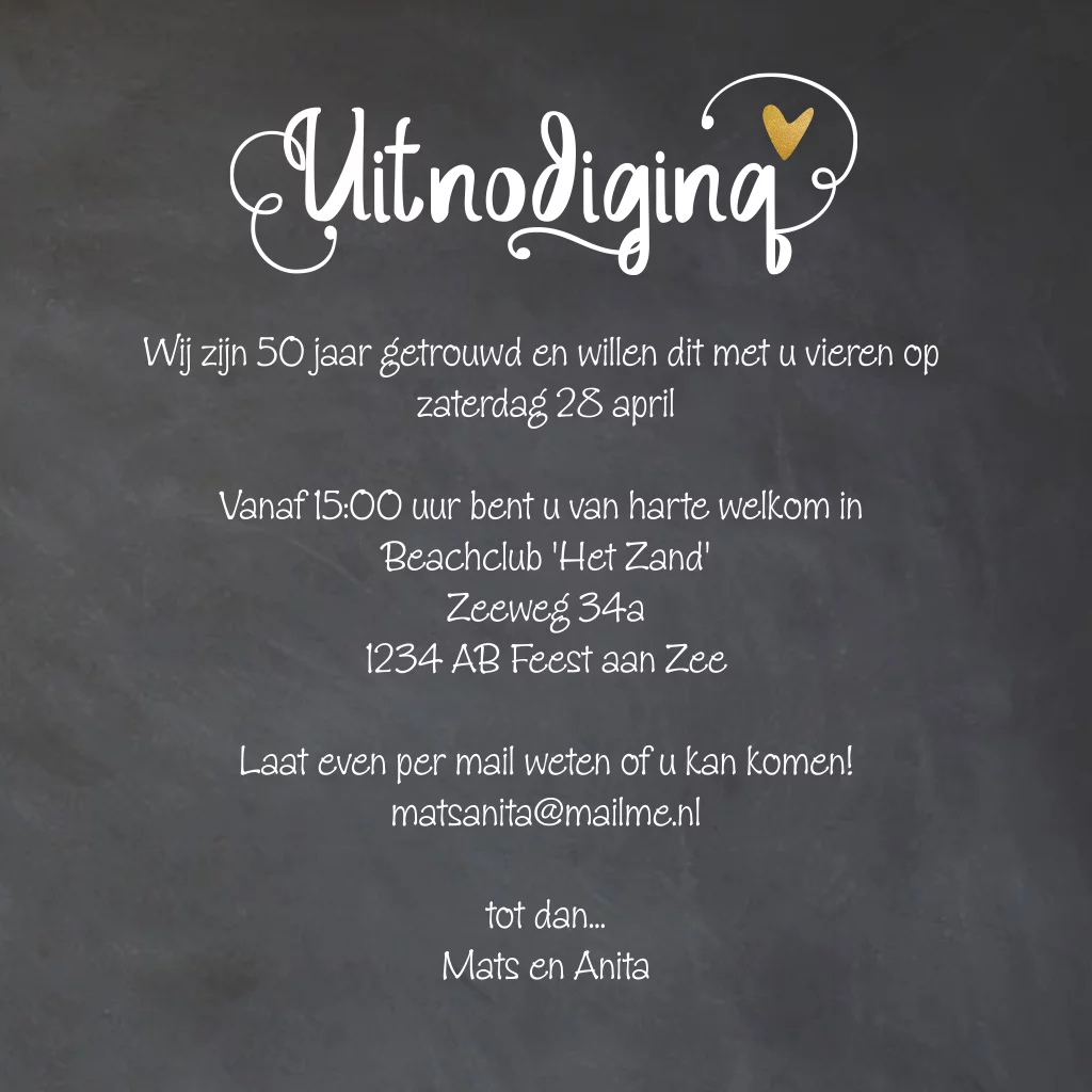 Eerdaags jullie 50 jarig huwelijks jubileum feest geven? Mooie uitnodiging met goud look (geen echt goud inkt) krijtbord print en hand lettering.