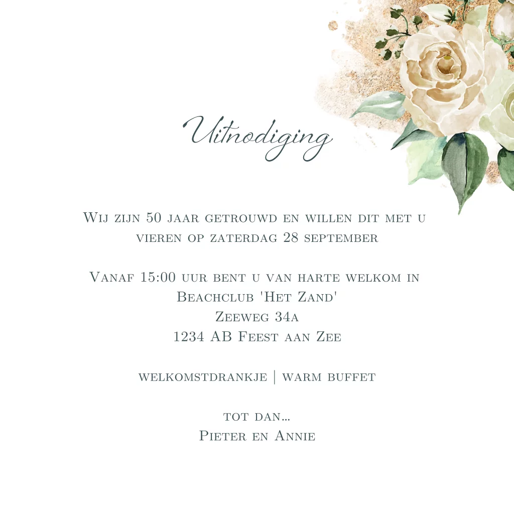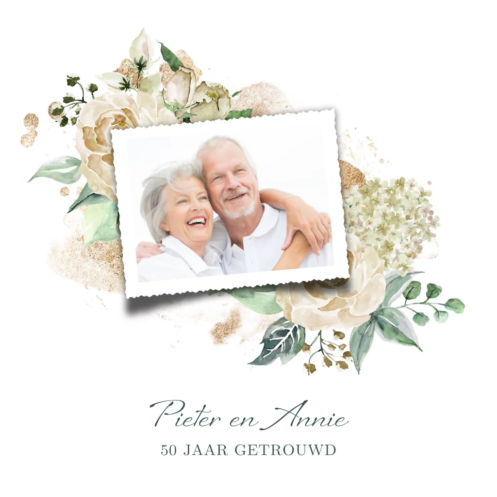 Foto uitnodiging gouden huwelijk witte hortensia en rozen