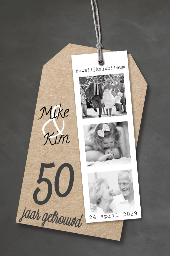Hippe enkele foto 50 jubileumfeest uitnodiging met krijtbord print, fotostrip, kraft label en losse teksten. Meerder formaten mogelijk. Aan 2 zijdes te bedrukken en te ontwerpen.