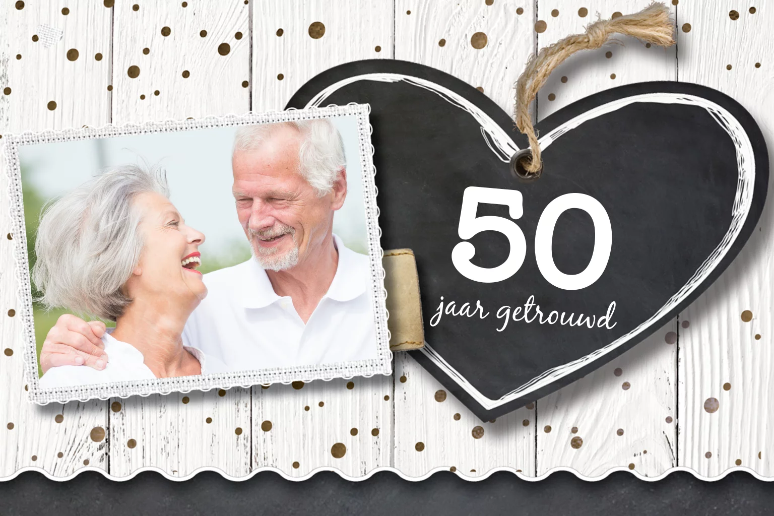 Eerdaags 50 jaar getrouwd? Mooie enkele uitnodiging voor jullie feest met hout print, koper dots en groot krijtbord hart. Vervang de foto en de tekst! Achterkant is ook vrij te bewerken.