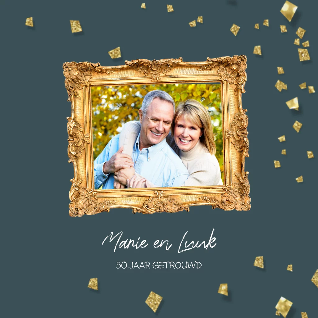 Eerdaags jullie 50 jarig huwelijks jubileum feest geven? Feestelijke kaart met ruimte voor 1 foto in het foto lijstje! Met goud glitter look confetti snippers met 3-D effect! Achtergrond kleur is aan tte passen. (goud - geen echt goud inkt).