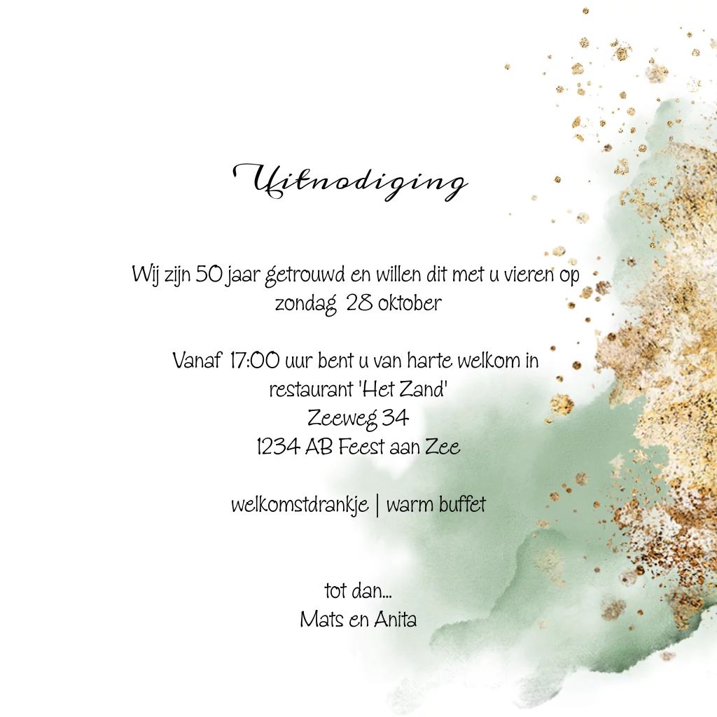 Eerdaags jullie 50 jarig huwelijks jubileum feest geven? Mooie uitnodiging met goud look verf brush (geen echt goud inkt) goud print confetti, geovorm en groene watercolor.