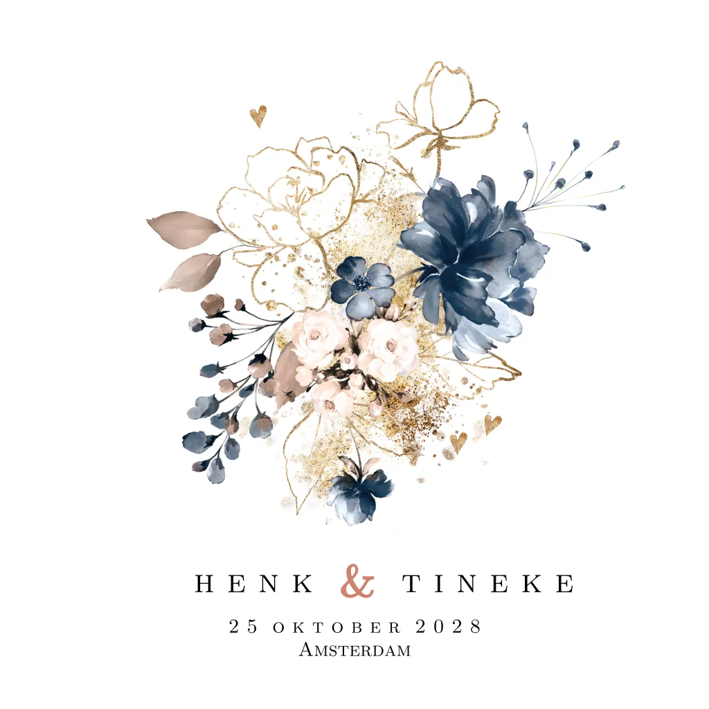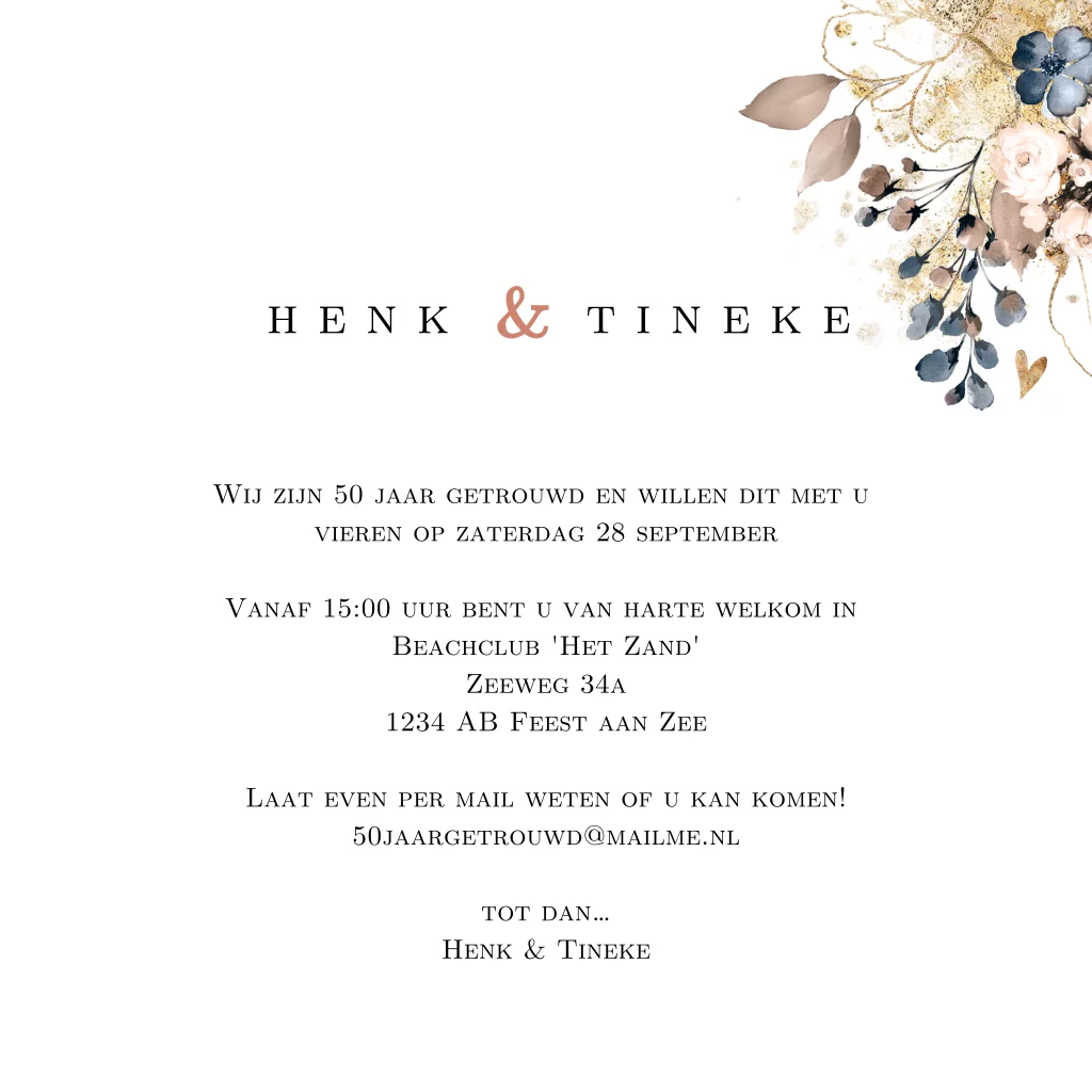 Eerdaags jullie vijftig jarig huwelijks jubileum feest geven? Feestelijke uitnodiging met donkerblauwe, rose en goudpoeder look watercolor boeket bloemen.