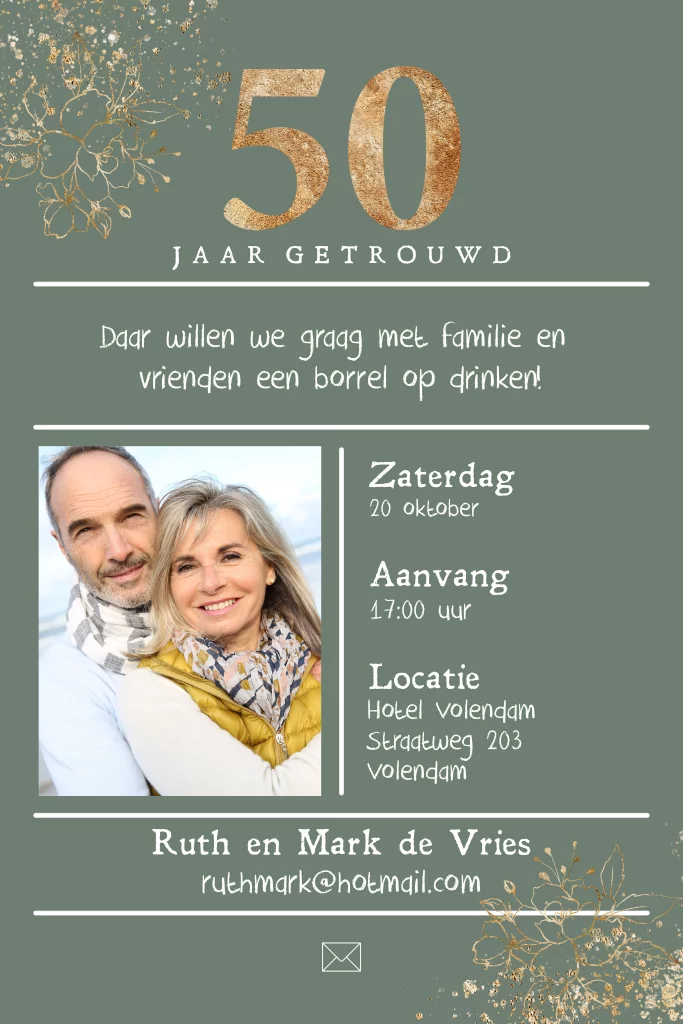 50 jaar getrouwd? Super feestelijke enkele uitnodiging met goud gekleurde spetters en bloemen, ruimte voor eigen foto, vast lijn verdeling voor je eigen tekst. Kaart zelf omkleuren. Optie ronde hoekjes.