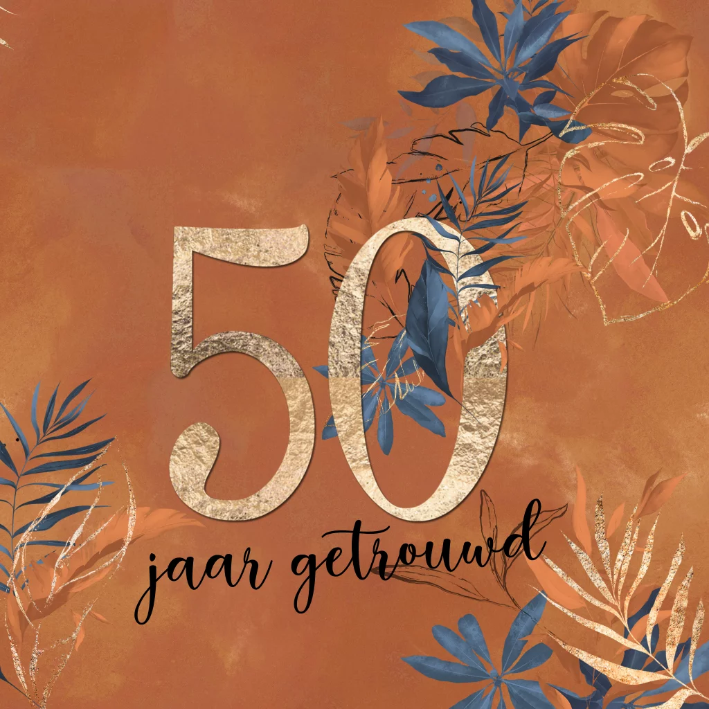 Velvet oranje look jubileum 50 jaar getrouwd uitnodiging met bloem en goudfolie look.