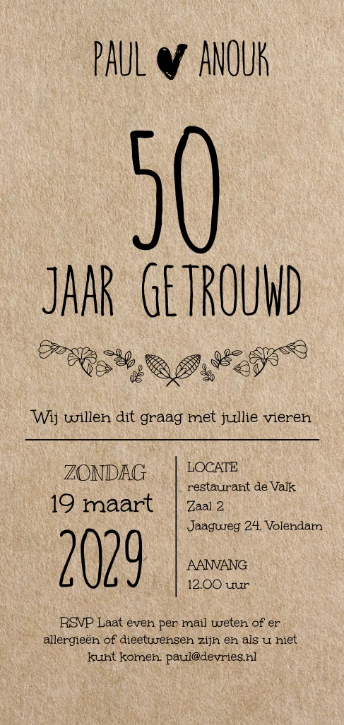 Moderne enkele kraft look grafische uitnodiging 50 jaar getrouwd met out-line bloem, lijn, hartje en losse teksten. Extra lang formaat 10x21cm.