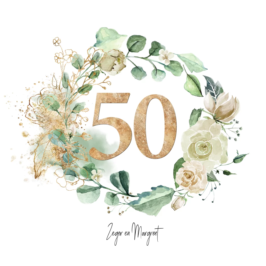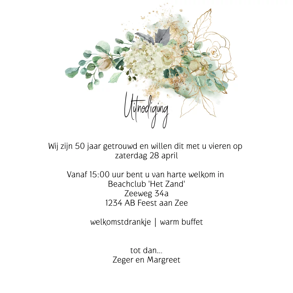 Eerdaags jullie 50 jarig huwelijks jubileum feest geven? Mooie uitnodiging met 50 in goud look (geen echt goud inkt), groene krans van bladgroen en witte hortensia bloemen en rozen in watercolor.