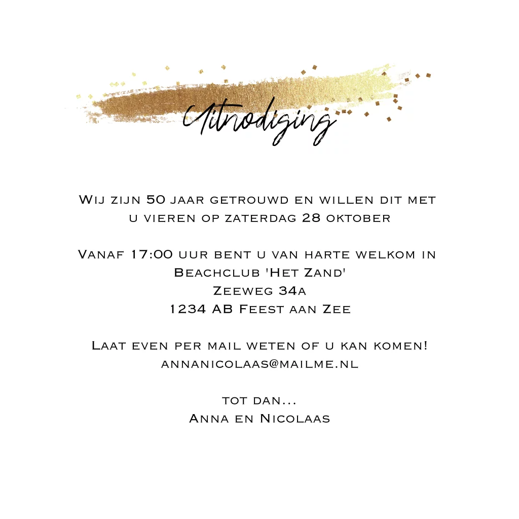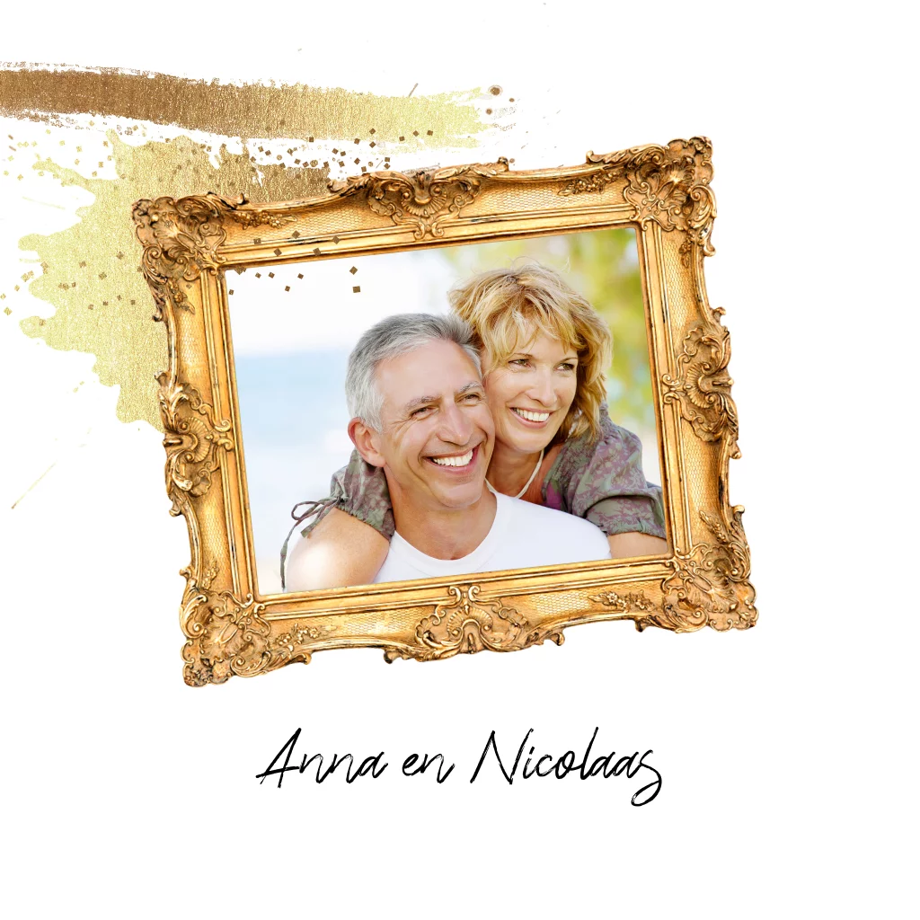 Eerdaags jullie vijftig jarig huwelijks jubileum feest geven? Stijlvolle uitnodiging met goudkleurig (geen echt goud) foto frame en oker gele watercolor versierd met een goudlook!