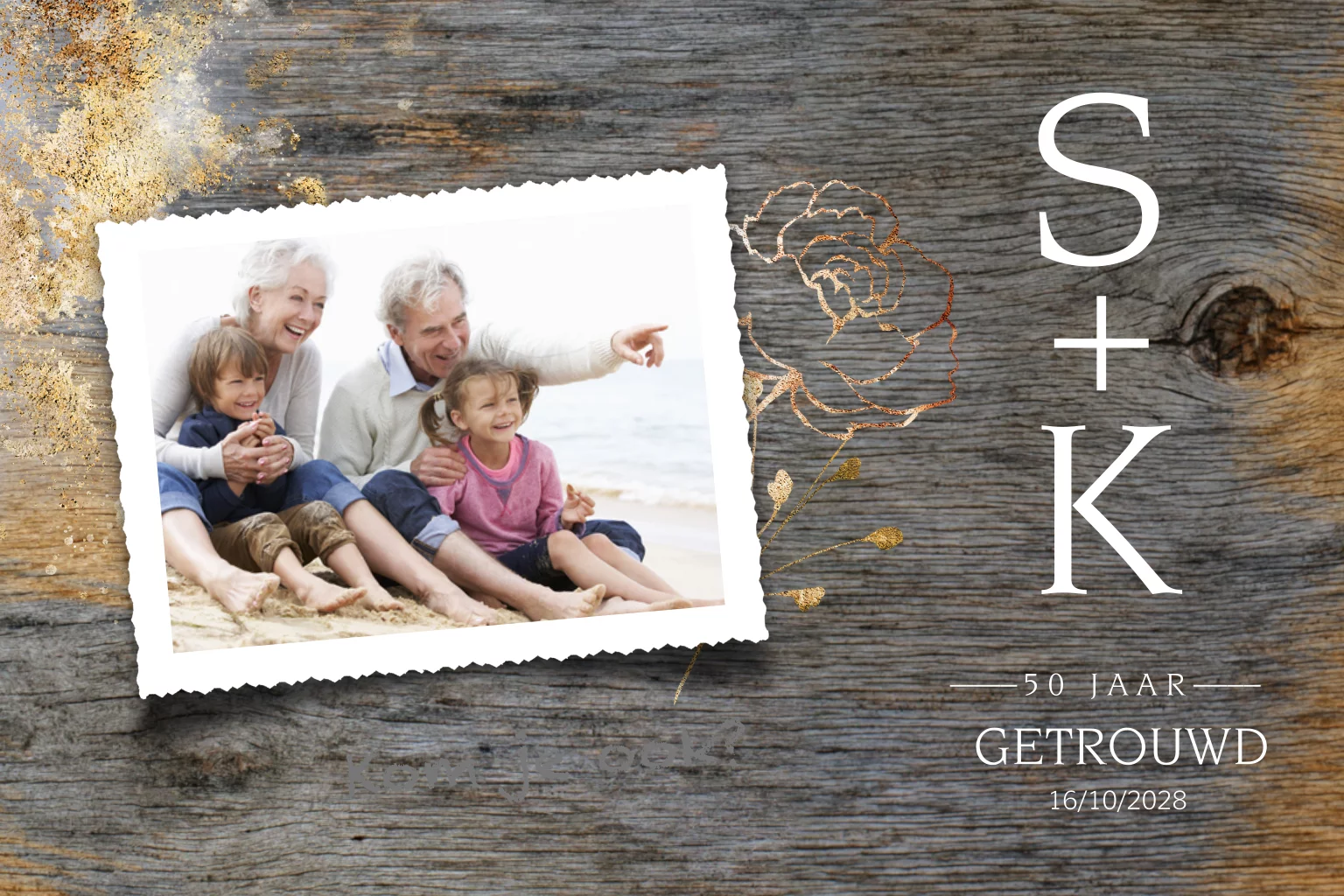 Stijlvolle uitnodiging voor jullie 50 jarig huwelijksjubileum. Ondergrond hout look. Versierd met fotokader voor jullie eigen foto, goudkleurige spetters en bloemen. (geen echt goud)