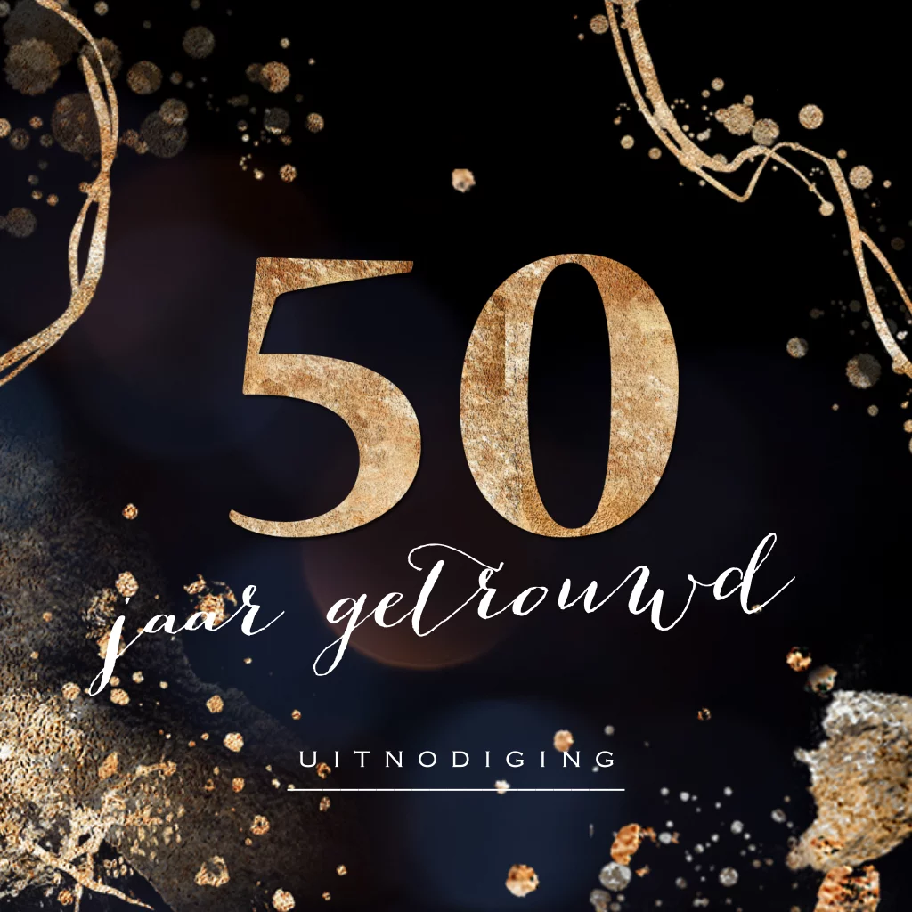 Prachtige uitnodiging voor een jubileum 50 jaar getrouwd met feestelijke blauwe ondergrond en goudlook confetti snippers.