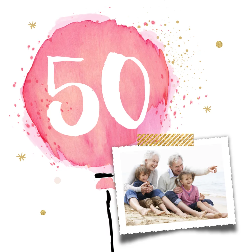 Eerdaags jullie 50 jarig huwelijksjubileum feest geven? Uniek foto uitnodiging ballon met roze waterverf effect, snippers en dots.