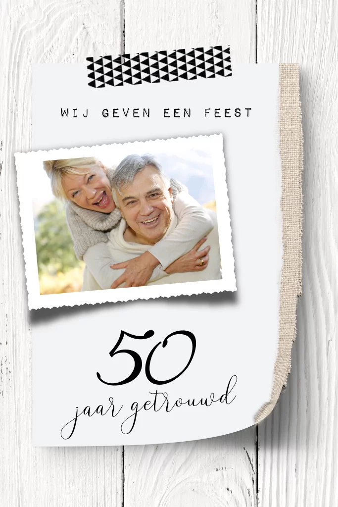 Eerdaags 50 jaar getrouwd? Mooie foto uitnodiging voor jullie feest met witte hout print en jutte look.