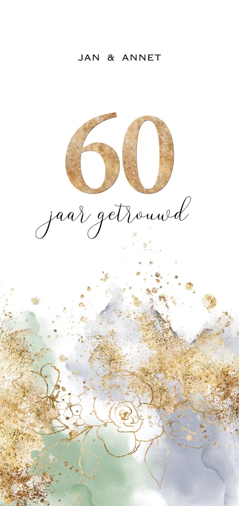 Uniek extra lang formaat uitnodiging 60 jarig huwelijksjubileum met mint groene en blauwe watercolor look, en goud look brush met outline bloemen. Zelf maken!