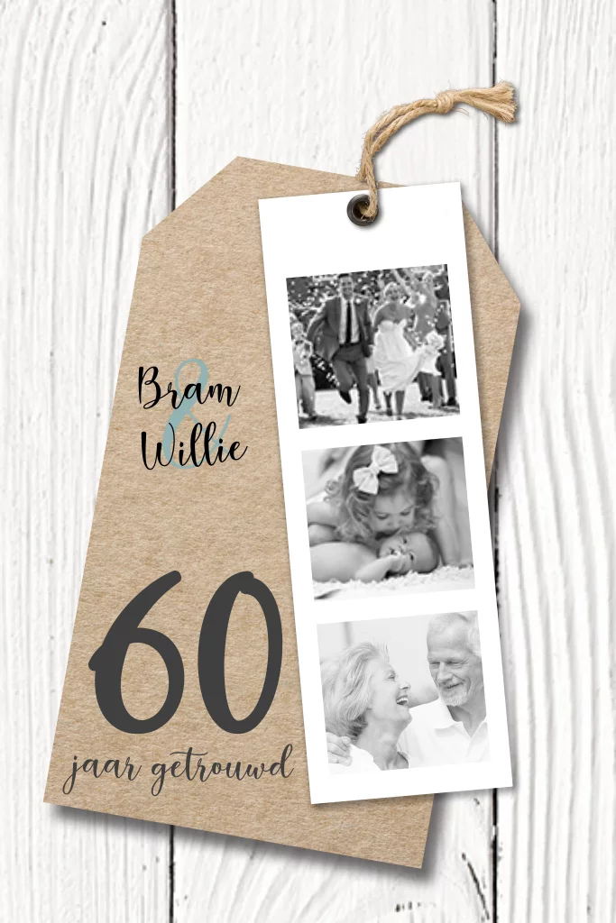 Stijlvolle enkele foto 60 huwelijksjubileum feest uitnodiging met hout look, fotostrip, kraft look label en losse teksten.