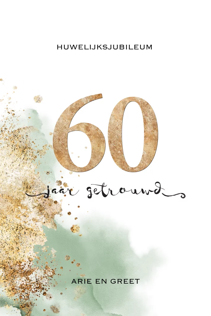 Opzoek naar een romantic chique 60 jarig huwelijksjubileum uitnodiging? Met mint groene watercolor met goudlook op de ondergrond. Zelf maken!